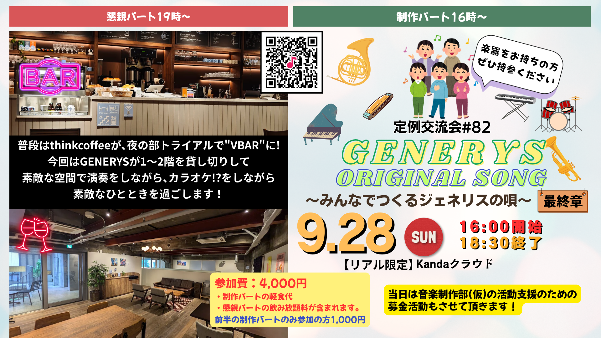 これまで2回に渡りテスト営業しているthinkcoffee夜の部のBAR営業ですが、今回はGENERYSイベントと正式にコラボすることになりました! まだ2階の素敵なカフェラウンジを使ったことがない方には特にオススメ! GENERYSがジャックしますので、楽器演奏もカラオケもOKです お酒や飲み物は、1階カフェカウンターでバーテンさんが提供してくれます(飲み放題)!